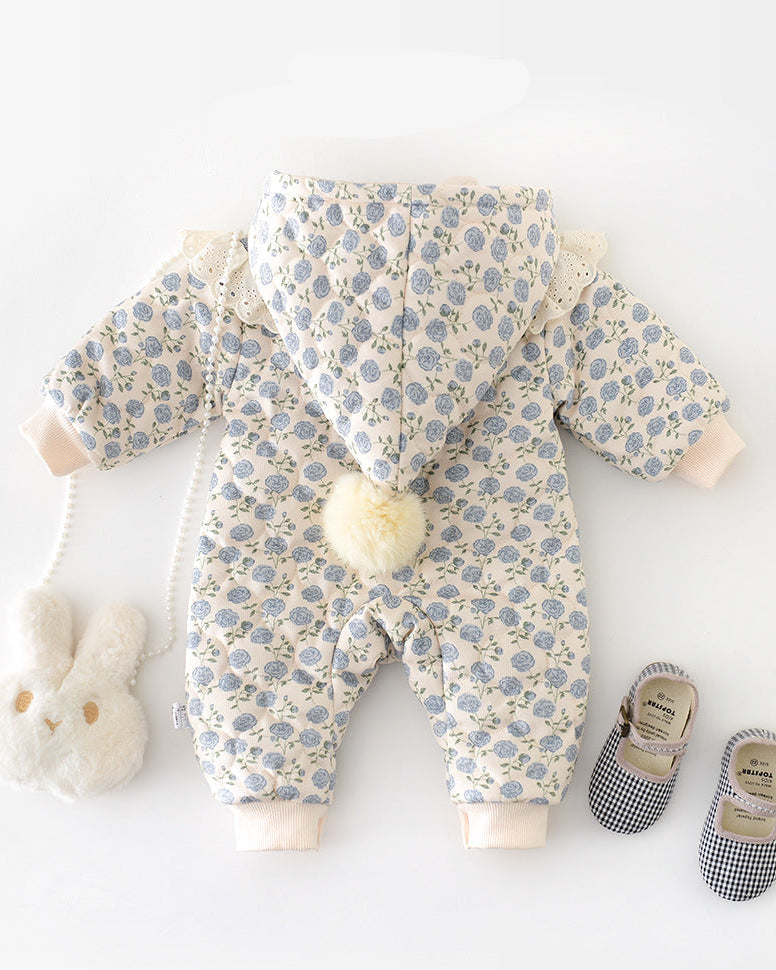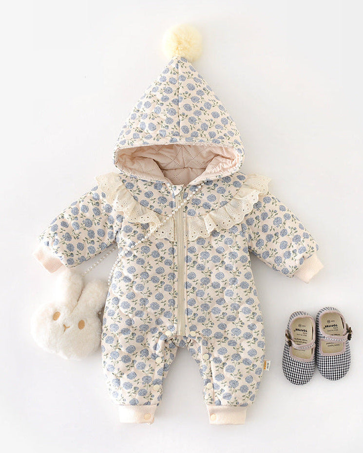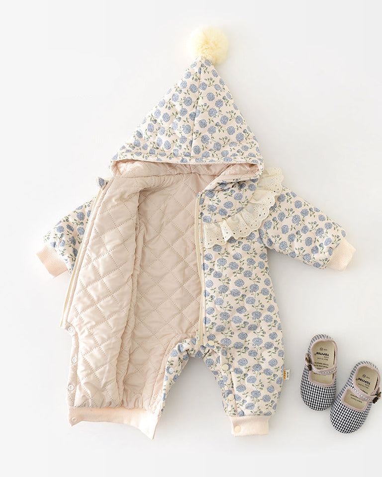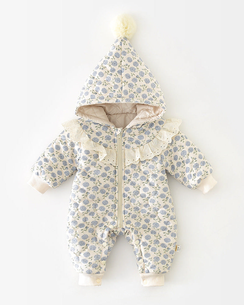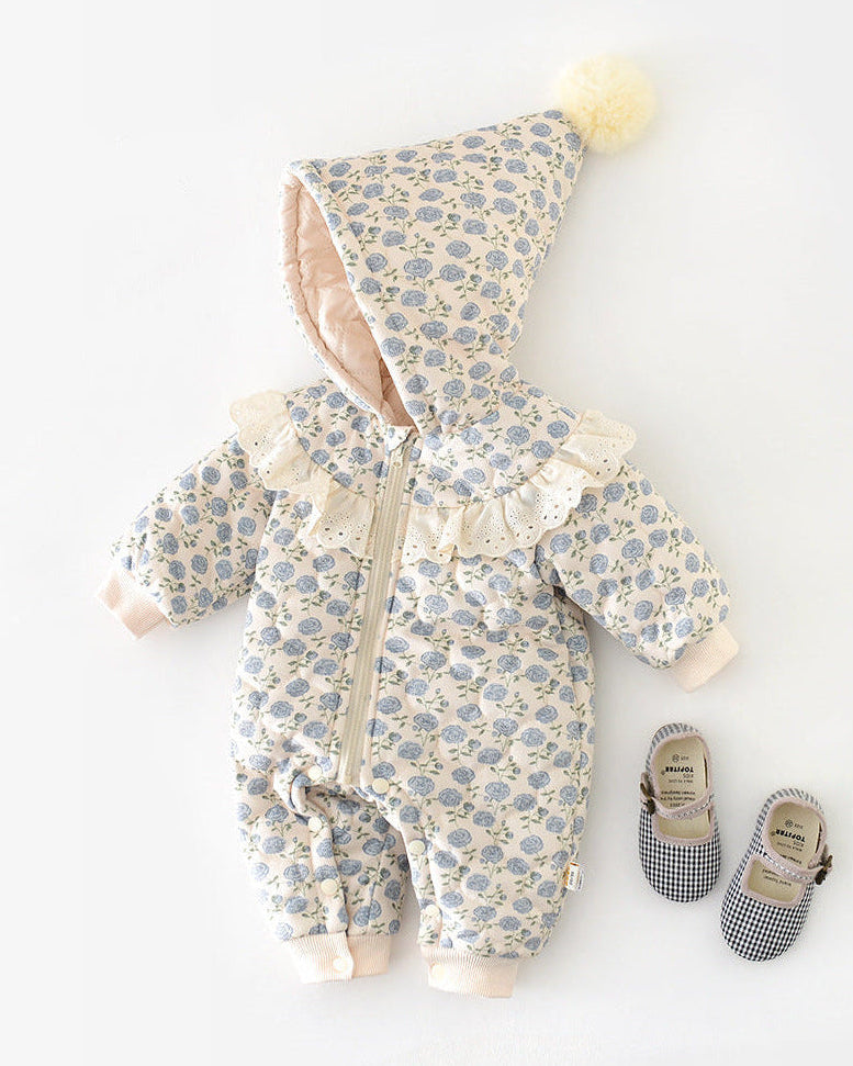 花柄レースのジップ付きベビーフード付きジャンプスーツ