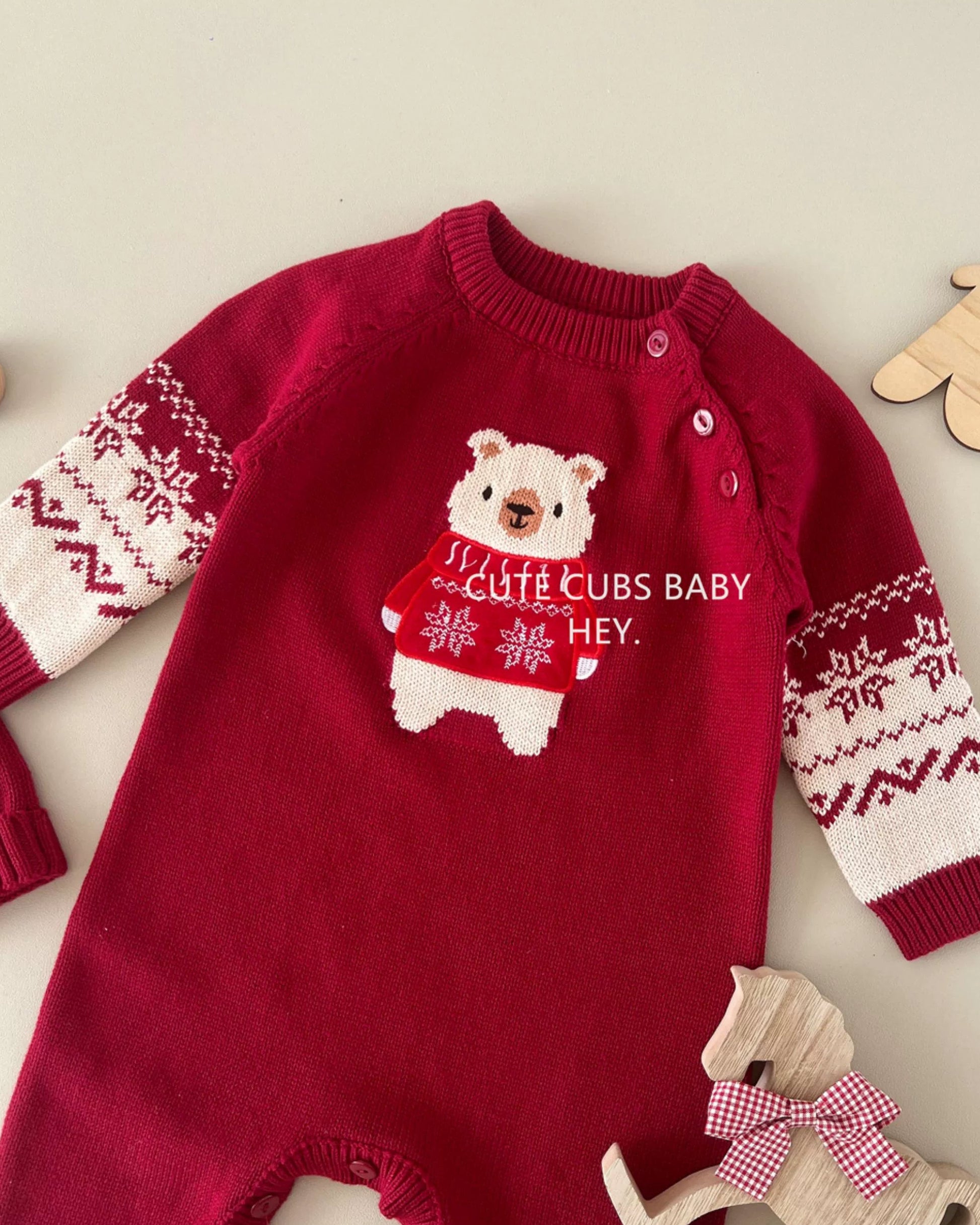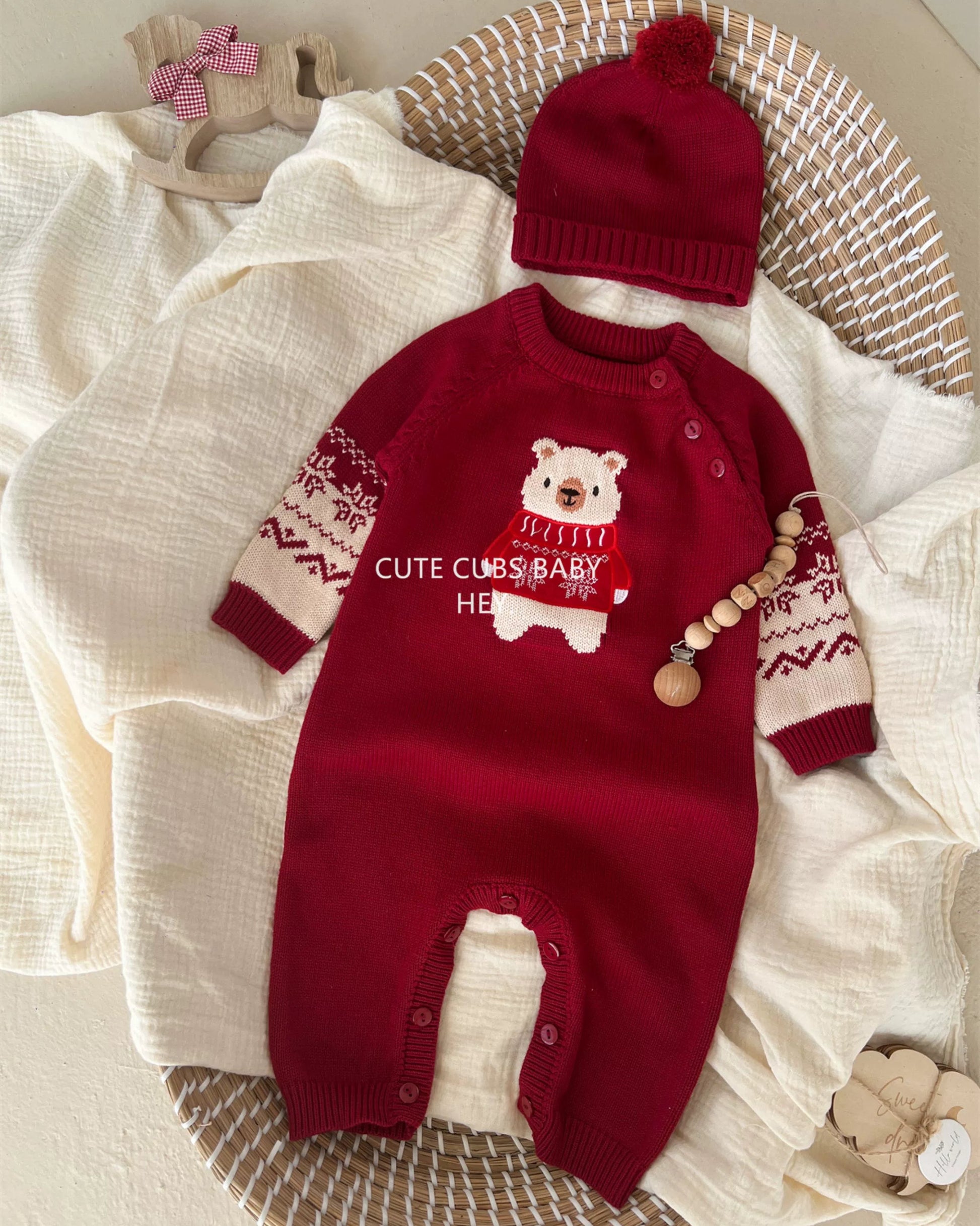 Bear Pattern Knitted Baby Jumpsuits Hat 2pcs Set